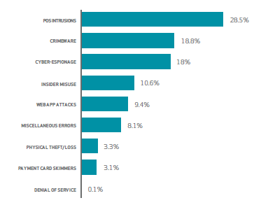 First, the obvious one. POS intrusion spiked from 0.7% to 28.5%. This wasn’t entirely surprising considering every other article I read about a data breach pointed to malware infected POS terminals. Web application attacks also more than doubled from 4.1% to 9.4% (nice to know I have job security). And denial of service attacks almost didn’t even make the list, coming in at 0.1%. Verizon does a very good job of breaking down each pattern by industry, definitely go take a look (page 34 of the report).